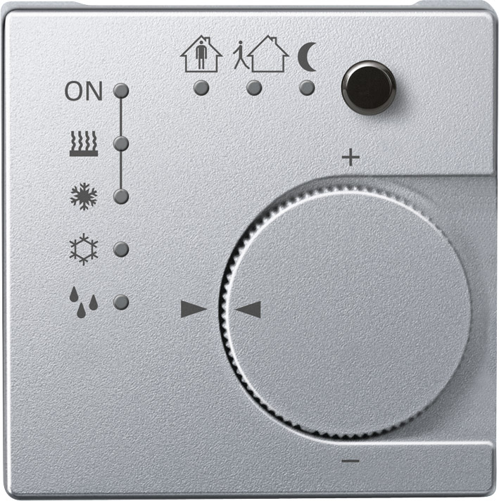 The device is a room temperature control unit and a binary input. Depending on the operating mode, the current temperature setpoint value and the room temperature, a control value for the heating or cooling control unit is transmitted to the KNX. The temperature can either be recorded by the internal or the external temperature sensor which must be connected to the push-button interface.