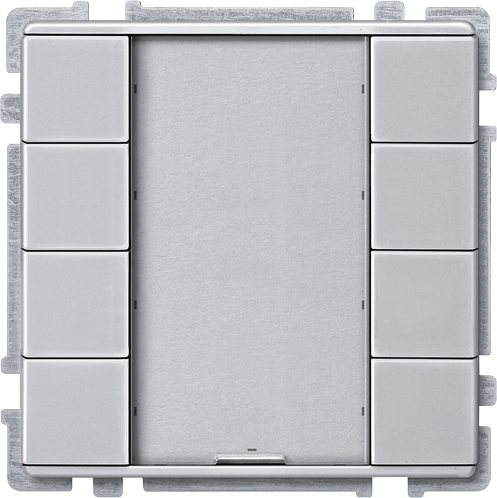 With integrated bus coupling unit. Push-button with eight operating buttons, operating display, eight blue status displays which can be triggered separately, and a labeling field. The blue operating display can also be used as an orientation sign. The lower labeling field can be parameterised as an additional operating key. The push-buttons are freely parameterisable as push-button pairs (dual-surface) or as single push buttons. The device is connected to the bus line with a bus connecting terminal.